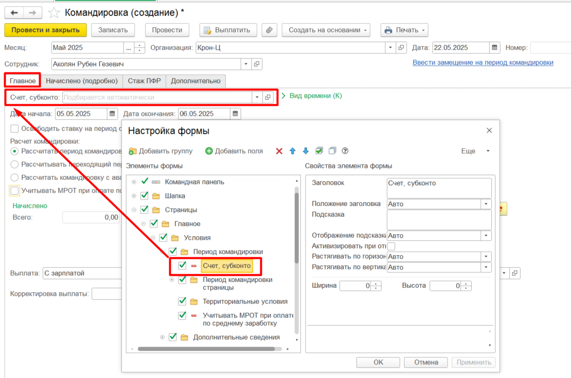 Рассмотрим на примере документа Командировка. При начислении командировки распределение по источникам можно настроить из документа. Этот реквизит в типовом варианте расположен на последней вкладке Дополнительно. Чтобы не забыть его поменять, можно перенести данный реквизит на вкладку Главное. Сделать это можно нажав на кнопку Еще – Изменить форму. В открывшемся окне найти реквизит, который хотим перенести, и перетащить его в нужное нам поле, зажав клавишу мыши, либо перенести синими стрелочками в форме настроек.