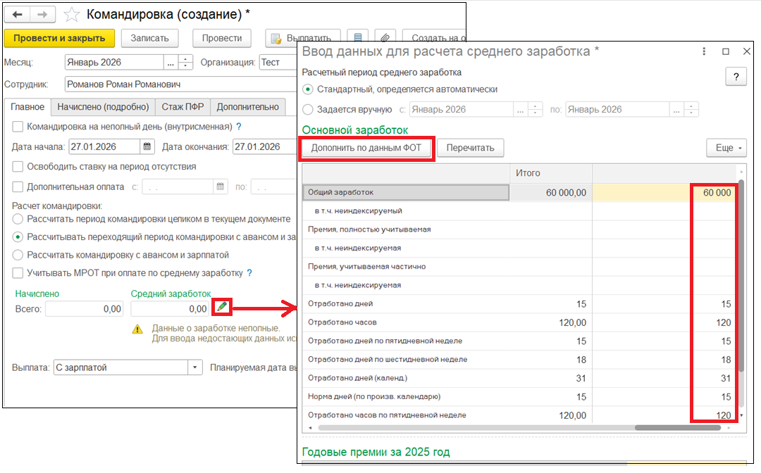 В программе расчет среднего осуществляется следующим образом: в новом документе Командировка необходимо перейти на форму расчета среднего заработка, нажав на Карандаш и заполнить сумму заработка по кнопке Дополнить по данным ФОТ.