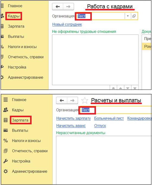 Если в одной базе ведется несколько организаций, но есть потребность, чтобы при открытии журнала или списка документов всегда выводилась конкретная (например головная), сделать в программе это можно, установив ее в разделе Кадры - Работа с кадрами или в разделе Зарплата - Расчеты и выплаты.