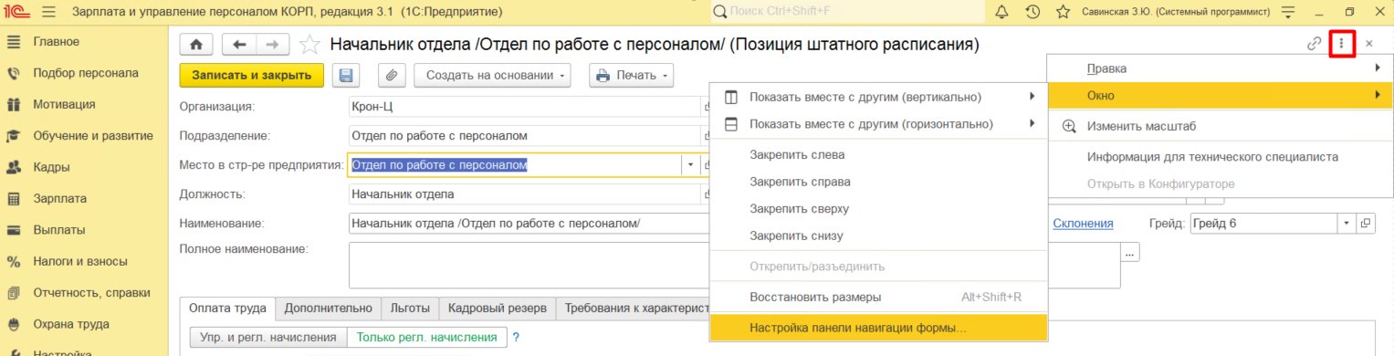 Для быстрого просмотра всех сотрудников, занимающих определенную должность в штатном расписании достаточно зайти в любую позицию штатного расписания и в правом верхнем углу кликнуть на три точки, затем навести курсор на раздел Окно и в открывшейся форме выбрать Настройки панели навигации формы.