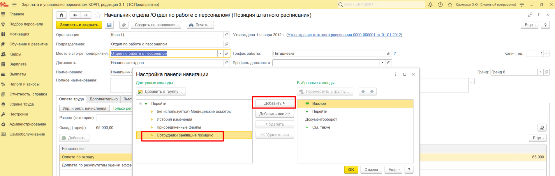 В открывшимся окне в левой части формы раскрываем раздел Перейти и выбираем Сотрудники, занявшие позицию, а затем по кнопке Добавить переносим данную ссылку в правую сторону формы.