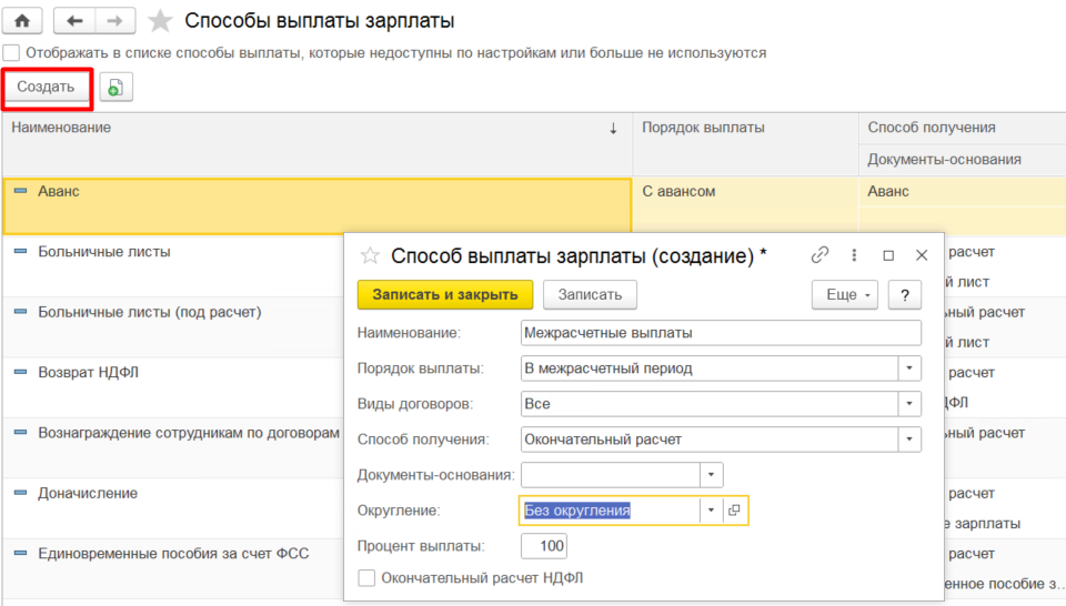 Для удобства и экономии времени разные межрасчетные начисления, которые необходимо выплатить между основными датами выплаты зарплаты, возможно отразить одной ведомостью. Необходимо сначала перейти в раздел Настройка, затем зайти в справочник Способы выплаты заработной платы. Далее по кнопке Создать добавить новый способ выплаты, где заполнить следующие настройки:
