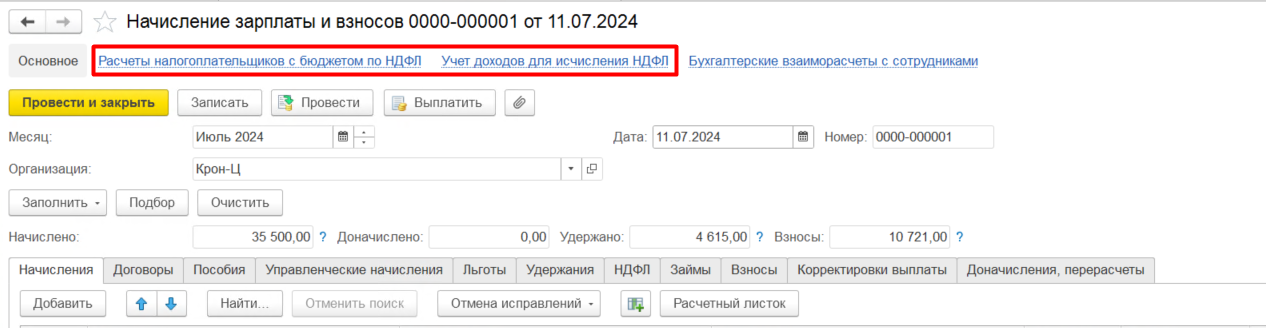Таким образом можно вывести ссылки на нужные нам регистры в различных формах документов. Актуальным бывает вывод ссылок на регистры накопления, например, Учет доходов для исчисления НДФЛ и Расчеты налогоплательщиков с бюджетом по НДФЛ в документах Начисление зарплаты и взносов и Ведомость в банк.