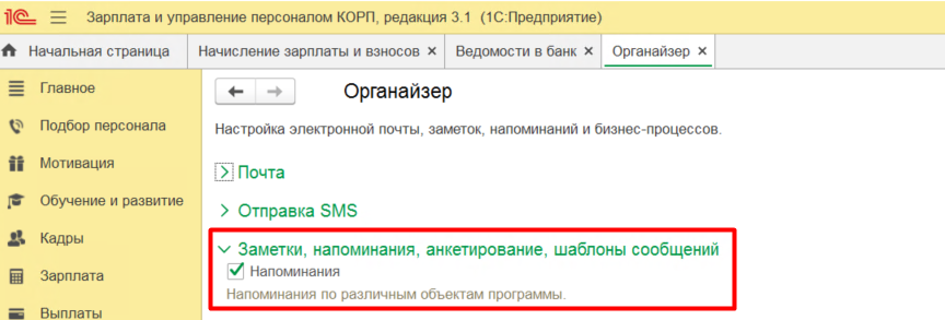 Всем известно о напоминаниях про дни рождения в ЗУП, но есть и другие не менее полезные напоминания при работе с другими объектами системы, например с документами. Сначала нужно включить функцию Напоминания — сделать это можно через Администрирование - Органайзер – Заметки, напоминания, анкетирование, шаблоны сообщений.