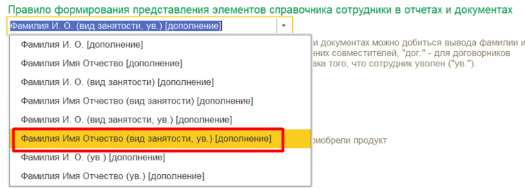 Меню Настройка – Кадровый учет – Правило формирования представления элемента справочника сотрудники в отчетах и документах. По умолчанию установлено значение Фамилия Имя Отчество [дополнение], изменяем на Фамилия Имя Отчество (вид занятости, ув.) [дополнение].