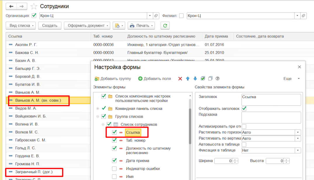 Затем возвращаемся в справочник Сотрудники, переходим по кнопке Еще - Изменить форму и снимаем галку с элемента формы Имя, устанавливаем галку на элемент Ссылка.