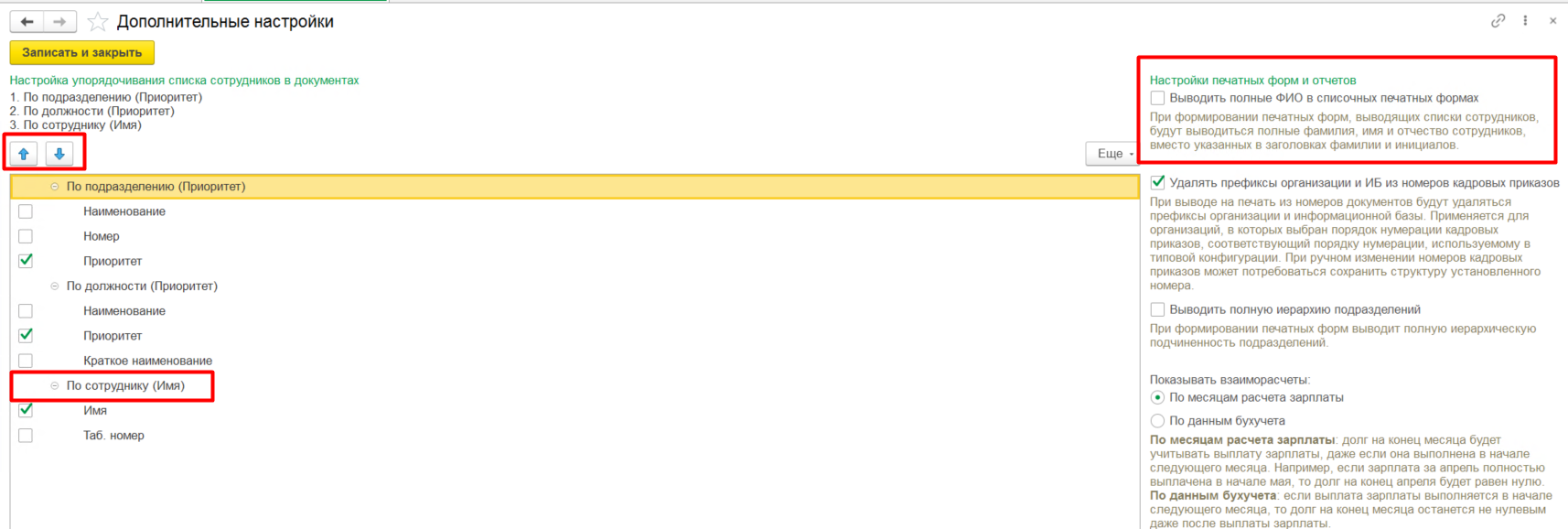 Удобно настроить заполнение документов в алфавитном порядке. Сделать это можно в меню Настройка – Дополнительные настройки. В открывшемся окне стрелочками вверх/вниз можно настроить упорядочивание списков. Если нужно, чтобы документ заполнялся по ФИО, нужно перетащить поле По сотруднику (Имя) наверх.