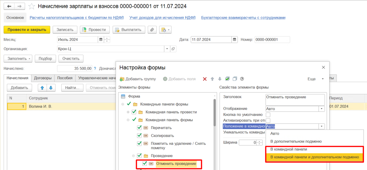 При желании команду Отменить проведение можно вынести в шапку документа следующими действиями. Переходим по верхнему значку Еще – Изменить форму.