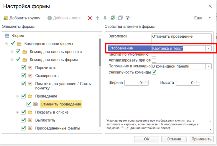 Открывается окно настройки формы, где выбираем строку Командная панель формы – Проведение – Отменить проведение.