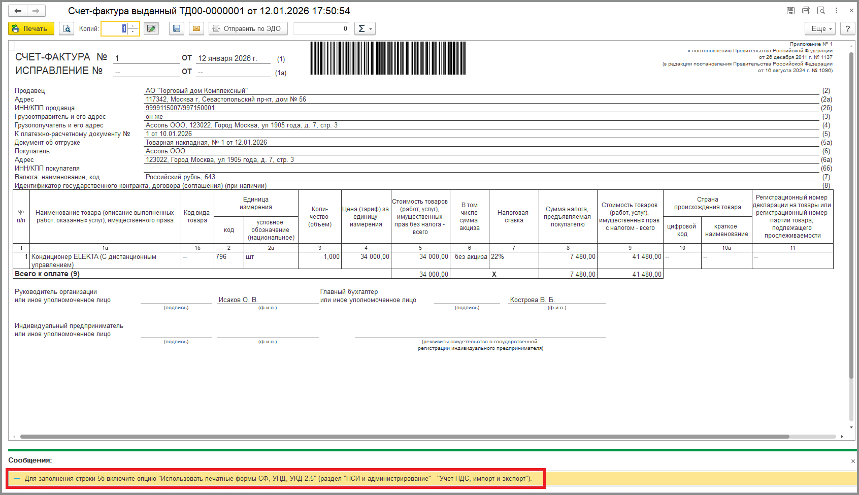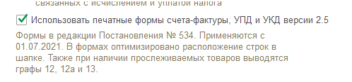 В случае когда в информационной базе эта опция выключена, в печатной форме счета-фактуры (УПД) строка 5б отсутствует и выводится соответствующее предупреждение: