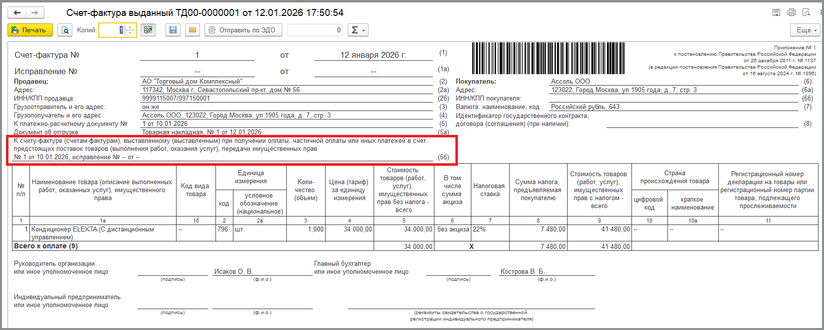 С 1 января 2026 года вступает в силу Федеральный закон от 28.11.2025 № 425-ФЗ, которым внесены многочисленные поправки в НК РФ. Одна из поправок касается порядка заполнения счета-фактуры. Согласно новой редакции пп. 4 п. 5 ст. 169 НК РФ, в счете-фактуре на реализацию в счет полученной предоплаты необходимо будет указывать порядковый номер и дату составления авансового счета-фактуры, если при реализации (товаров, работ, услуг или имущественных прав) производится зачет полученной ранее предоплаты. В счете-фактуре добавилась графа 5б, в которой должна быть указана эта информация.