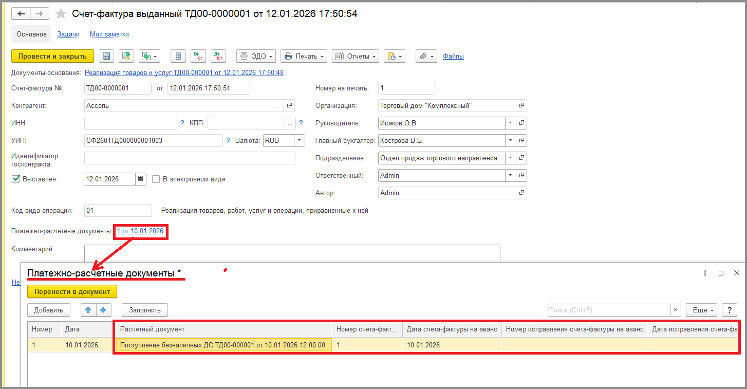 Начиная с версий 2.5.25.80 (2.5.22.134) 1С ERP Управление предприятием 2.5, Комплексная автоматизация 2, 11.5.25.80 (11.5.22.134) 1С: Управление торговлей 11, 3.0.189 1С Бухгалтерия предприятия 3.0, в документах Счет-фактура выданный и Счет-фактура выданный комиссионеру (агенту) на форму Платежно-расчетные документы добавлены новые колонки табличной части: Расчетный документ (документ поступления аванса), Номер счета-фактуры на аванс, Дата счета-фактуры на аванс, Номер исправления счета-фактуры на аванс, Дата исправления счета-фактуры на аванс. Новые реквизиты отображаются в счетах-фактурах с 01.01.2026 г.