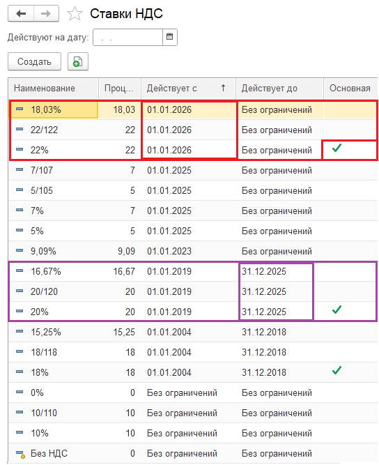 - добавлены значения 22%, 18,03% и 22/122, период действия с 01.01.2026,