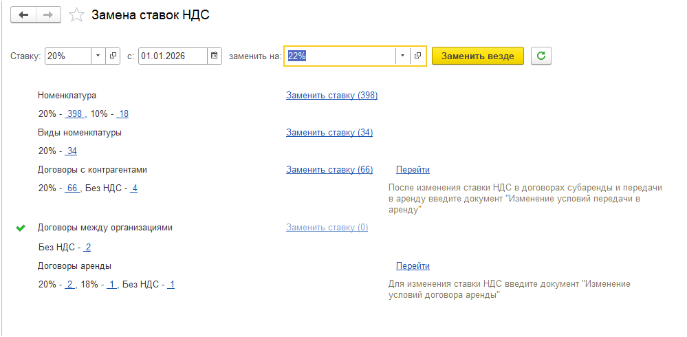 Нужно указать какую Ставку (например, 20%) заменить на какое значение (например, 22%) и с какой даты (например, с 01.01.2026). На указанную дату замена ставки НДС выполняется в справочнике Номенклатура, так как в указанном справочнике ставка НДС периодическая. В остальных справочниках новая ставка записывается при выполнении обработки.