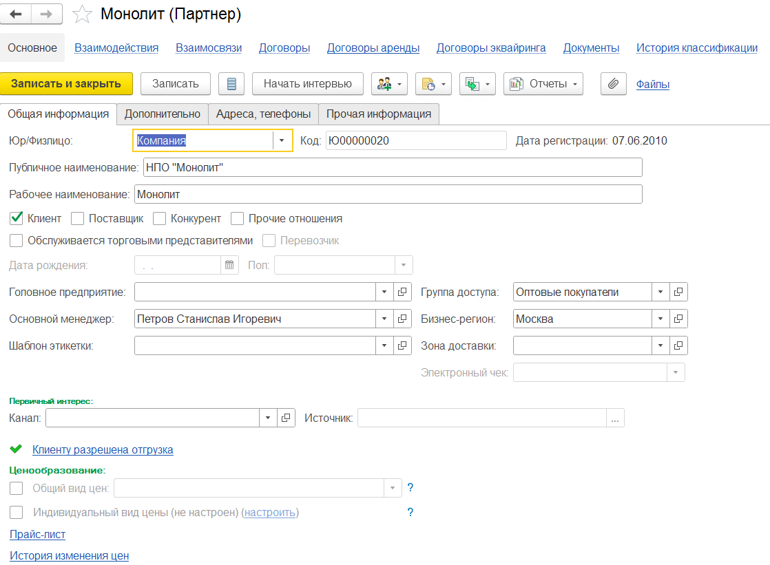 В карточке «Партнер» есть строка «Головное предприятие» — это многоуровневая связь, которая связывает «Партнеров». Используется только для управленческого учета.