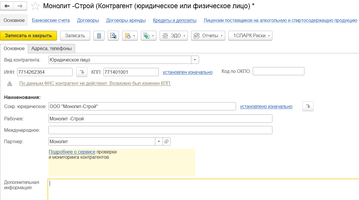 Справочник «Контрагенты» используется исключительно в регламентированном учете. Он организован согласно официальной информации: наименование, адрес, ИНН, КПП. Система автоматически по ИНН заполнит все официальные данные по контрагенту, нам лишь останется добавить факультативную информацию при необходимости.