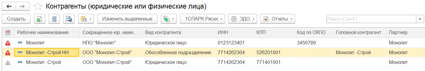 - Если одному «Партнеру» соответствовало несколько «Контрагентов», то объединение происходит с первым привязанным «Контрагентом». Даже если этот «Контрагент» помечен на удаление. Остальные перемещаются в архив. Следовательно, при объединении справочников каждому «Партнеру» должен соответствовать свой «Контрагент». Если «Контрагент» был помечен на удаление, то стоит создать и привязать к нему «Партнера» и также пометить его на удаление.